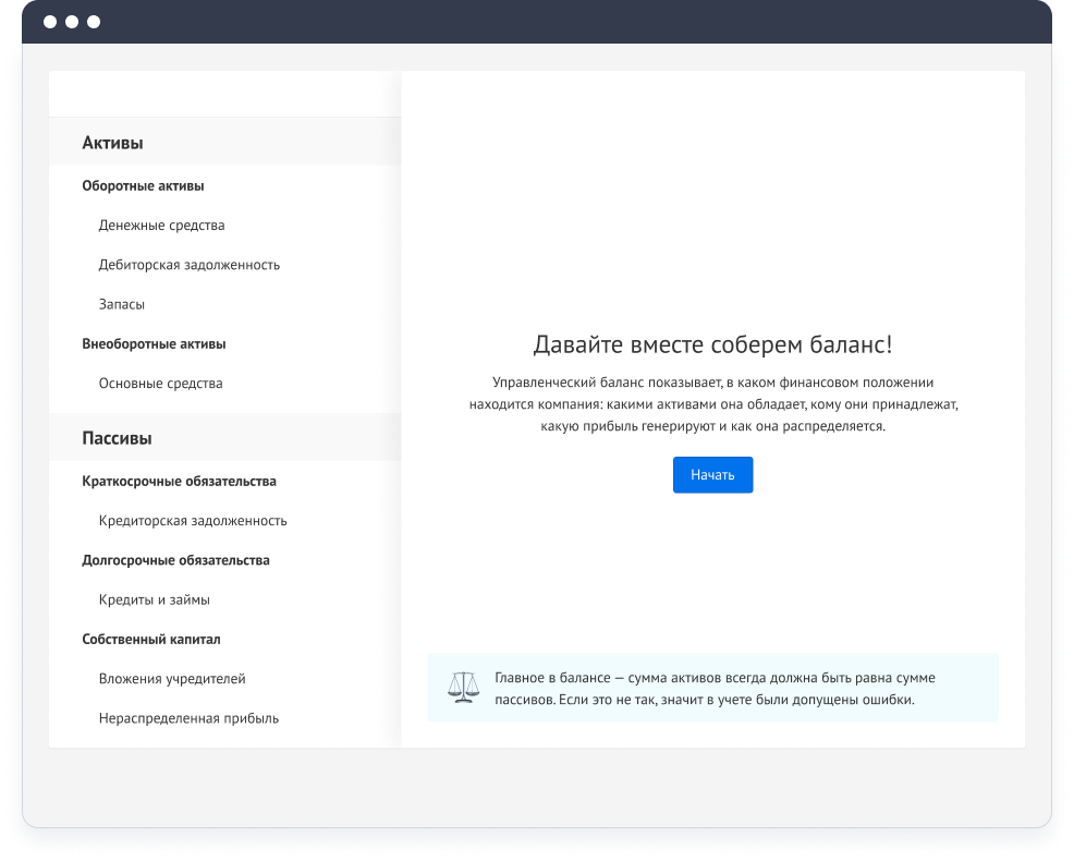 Специальный робот вместе с вами пройдет все этапы сверки денег, запасов, обязательств и капитала, чтобы активы точно сошлись с пассивами.
